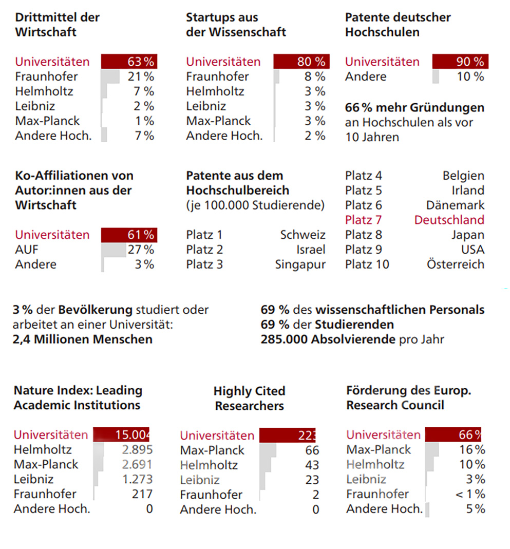 Im deutschen Wissenschaftssystem sind Universitäten die zentralen Knotenpunkte – zwischen Forschung, Lehre und Transfer, zwischen Industrie und Wissenschaft, zwischen Hochschulen und außerhochschulischer Forschung, zwischen nationaler und internationaler Vernetzung. Nur die Universitäten decken das gesamte Spektrum von der Grundlagenforschung bis zur anwendungsorientierten Forschung ab. Sie sind der erste Partner der Industrie, Inkubatoren für Start-ups und Orte interdisziplinärer Bildung, die hochqualifizierte Absolvent:innen hervorbringen – Fach- und Führungskräfte für morgen. Damit sind sie unerlässliche Akteurinnen bei der Umsetzung der Hightech Agenda.